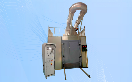 试验装置包括燃烧室、控制室、试样架(小推车)、框架、燃烧器(主燃烧器和辅助燃烧器,两个等腰直角三角形的砂盒燃烧器)、集气罩、收集器和导管、排烟系统和常规测量装置、燃气供应控制装置、烟密度测试系统、气体分析测试系统、数据收集分析装置。整体结构包括单体房间采用钢梁结构+防火采钢板,内墙壁为不锈钢板,实现板块化安装,便于拆装和具有现代设计美感。
