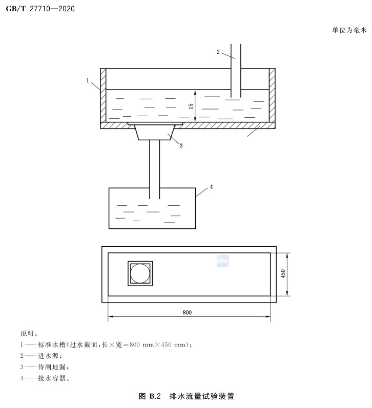 2.1、满足GB/T27710-2020标准6.6.3、7.6.3.1章节及附录图B.2的要求,测试为恒定水深15士1mm,测量地漏的排水流量,测试次数3次,每次测试2分钟