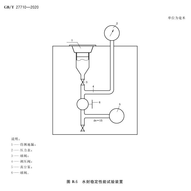 3.1、满足GB/T27710-2020标准6.6.6、7.6.6章节及附录图B.6的要求,测试气压真空度为400士10Pa,持续10s解除真空度,再测量剩余水封深度