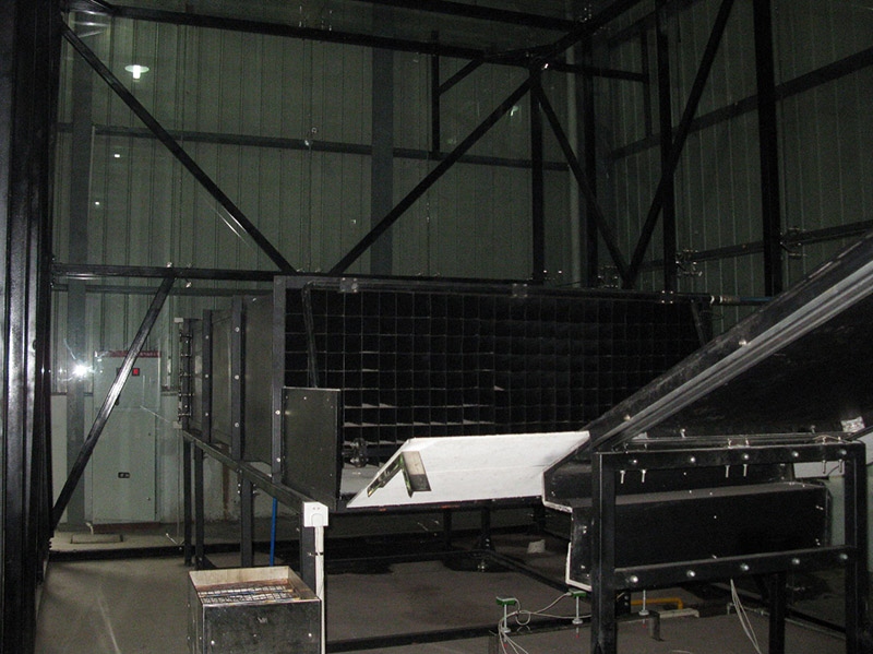 9.送气风量:风机风量约10000-45000m³/h。采用变频调节,保证测试过程气流从被测组件样品上表面均匀流过。气流速度用一块1m*1. 3m的胶合板在测试前标定,把胶合板放在斜坡上,倾斜度为:沿水平方向每增加300 mm,垂直高度增加127 mm,3个测量点位于斜坡中部,离板面高94mm,1个位于中心位置,2个位于距两边76 mm处,气流速度应为( 19+0.8) km/h;