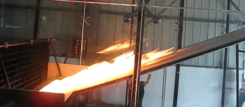 4.燃烧器:其结构为:一段长1.12m, 标称DN50mm (外径60.3mm) 的管道,在朝向试验平台的方向开有一个宽12.7mm,长910mm的缝。该燃烧器由标称25mm (外径33. 4mm)的管道从两端送燃气以维持均匀的压强。,调节燃烧器使得火焰呈三角形,火焰底端与水泥板接触位置宽约900mm,火焰沿着基板向上宽度缩小到约152mm。调节燃烧器燃气流量,使得A 级火焰、B级火焰温度为(760±28)℃,C级火焰温度为(704±28)℃。火焰温度测量采用标称直径为 2.0mm 的 K 型热电偶,热电偶测量位置位于距离基板底端中心朝向火源方向12.7mm且距基板表面 25.4mm 处,待火焰稳定后,每10s记录一次温度,校准时间为120s,取火焰平均温度;